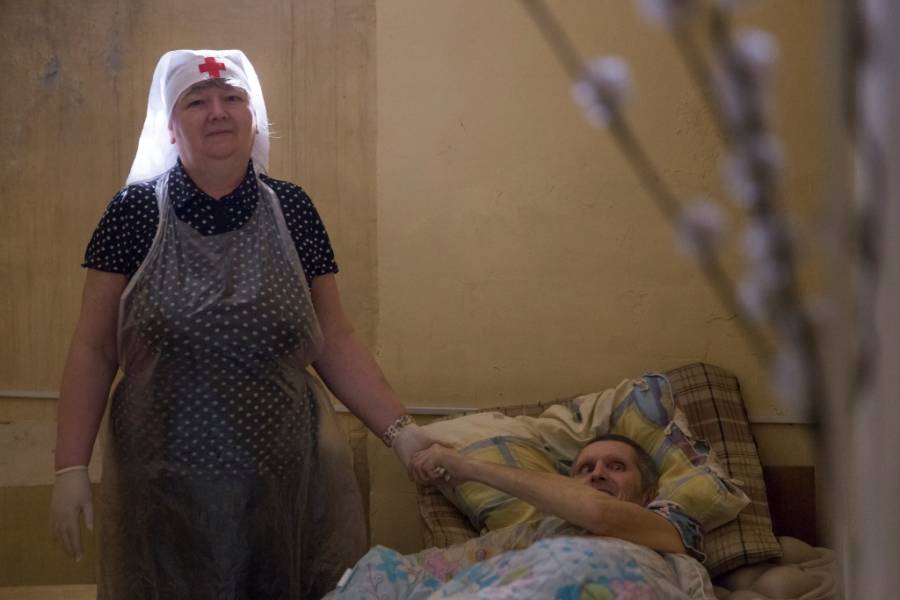 Женщина с чудесным именем Вера, хрупкая и худенькая, всегда улыбается, шутит. Самостоятельно Вера не встает, её привозят к нам на коляске, у неё ДЦП. Видя нас, она всегда от души желает всего самого доброго и искренне благодарит. Рассказывает, как всю жизнь работала в доме инвалидов и сама раньше мыла больных, пользовалась уважением и никогда не думала, что самой выпадет такая доля, что теперь за ней, немощной, постигнутой болезнью, приходится ухаживать.